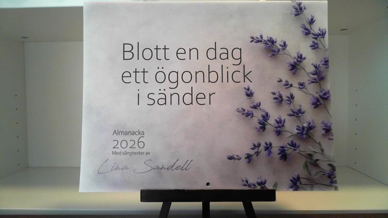 Blott en dag ett ögonblick i sänder. Almanacka 2026 med sångtexter av Lina Sandell och stämningsfulla bilder. Lina Sandell är en av Sveriges främsta psalmförfattare. Hon har skrivit några av våra mest älskade psalmer som t ex Blott en dag, Tryggare kan ingen vara och Bred dina vida vingar. I den här almanackan har vi samlat 12 av hennes vackraste sångtexter och kombinerat dem med stämningsfulla bilder. Kalendariet innehåller allmänna helgdagar, flaggdagar, namnsdagar, kyrkoårets helgdagar, de nordiska nationaldagarna och månens alla faser. Mått: 30 × 0,3 × 23 cm